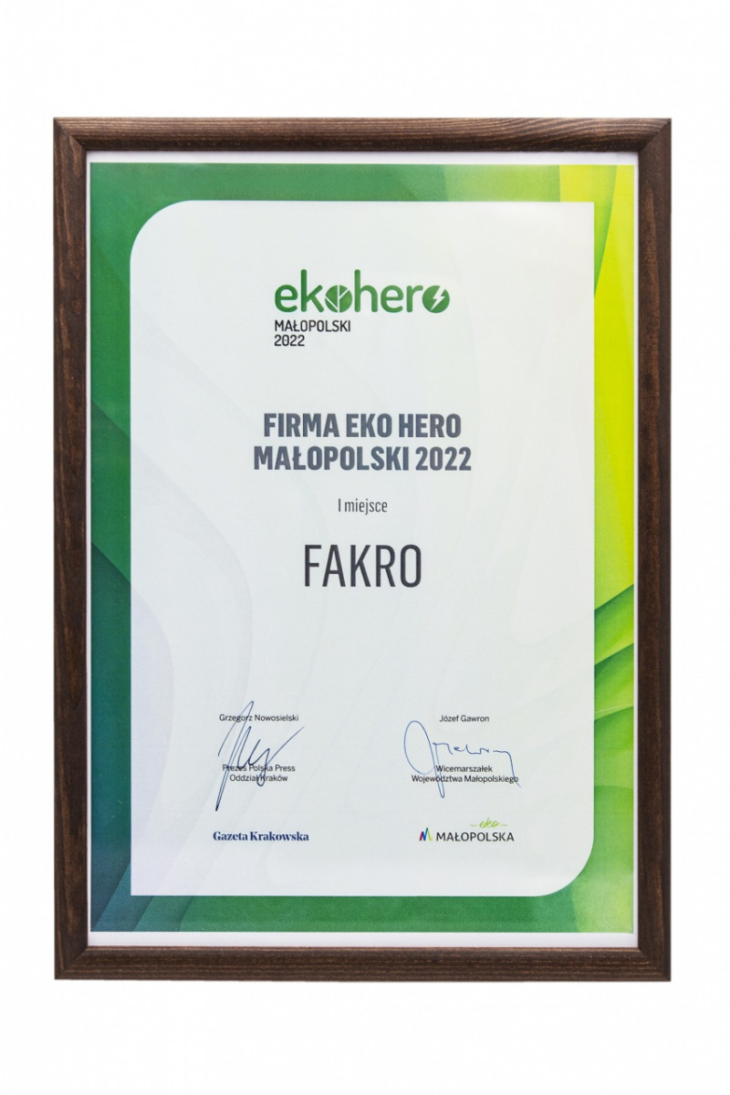 Firma FAKRO została zwycięzcą konkursu EKO- Hero Małopolski w kategorii firma. Nagrodę wręczono za inicjatywy, mające pozytywny wpływ na środowisko.